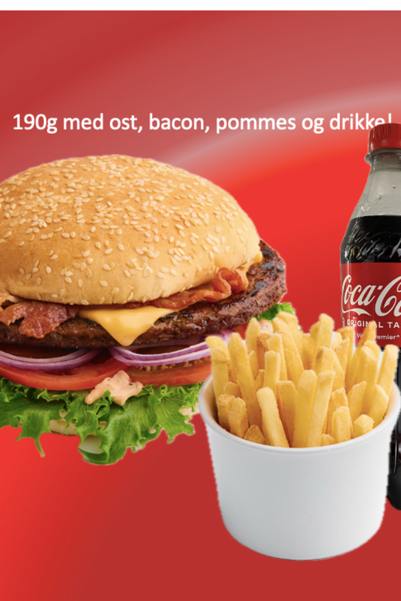 190g hamburger, pommes frites og drikke! Standard tilbehør: Salat, dressing, tomat og løk. Allergener: egg, sennep, sesamfrø. Kan innhold melk, nøtter, soya og selleri